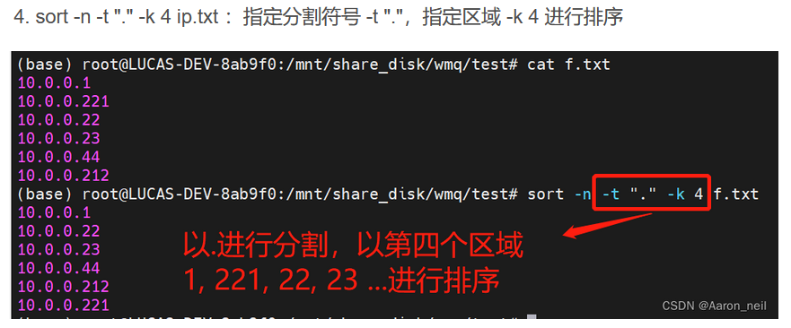 sort -n -r a.txt:对文件第一个字符进行反转排序,从大到小sort -n a.txt: 对文件第一个字符进行排序,默认从小到大sort -u a.txt: 对排序结果去重sort -n -t "." -k 4 ip.txt: 指定分割符号-t ".",指定区域-k 4进行排序(下图有示例)