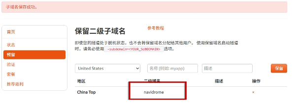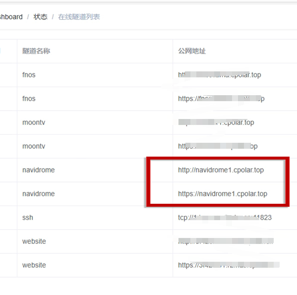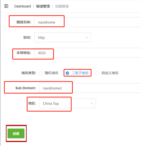 - 隧道名称:可自定义,本例使用了: navidrome 注意不要与已有的隧道名称重复