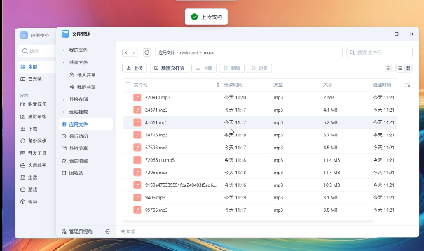回到飞牛主页打开文件管理,在刚才安装的路径当中上传好本地的音乐
