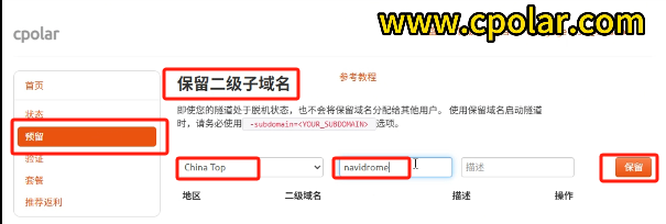 我们来登录cpolar官网,点击预留,选择保留二级子域名。地区选择china top 名称自定义,点击保留。