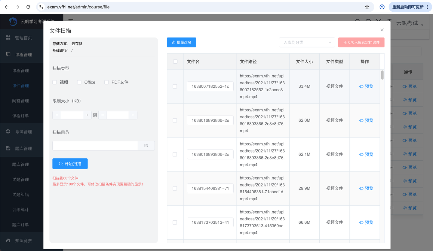 -- 增加课件自动扫描功能,支持批量扫描云存储中的视频&文件,批量添加到系统中