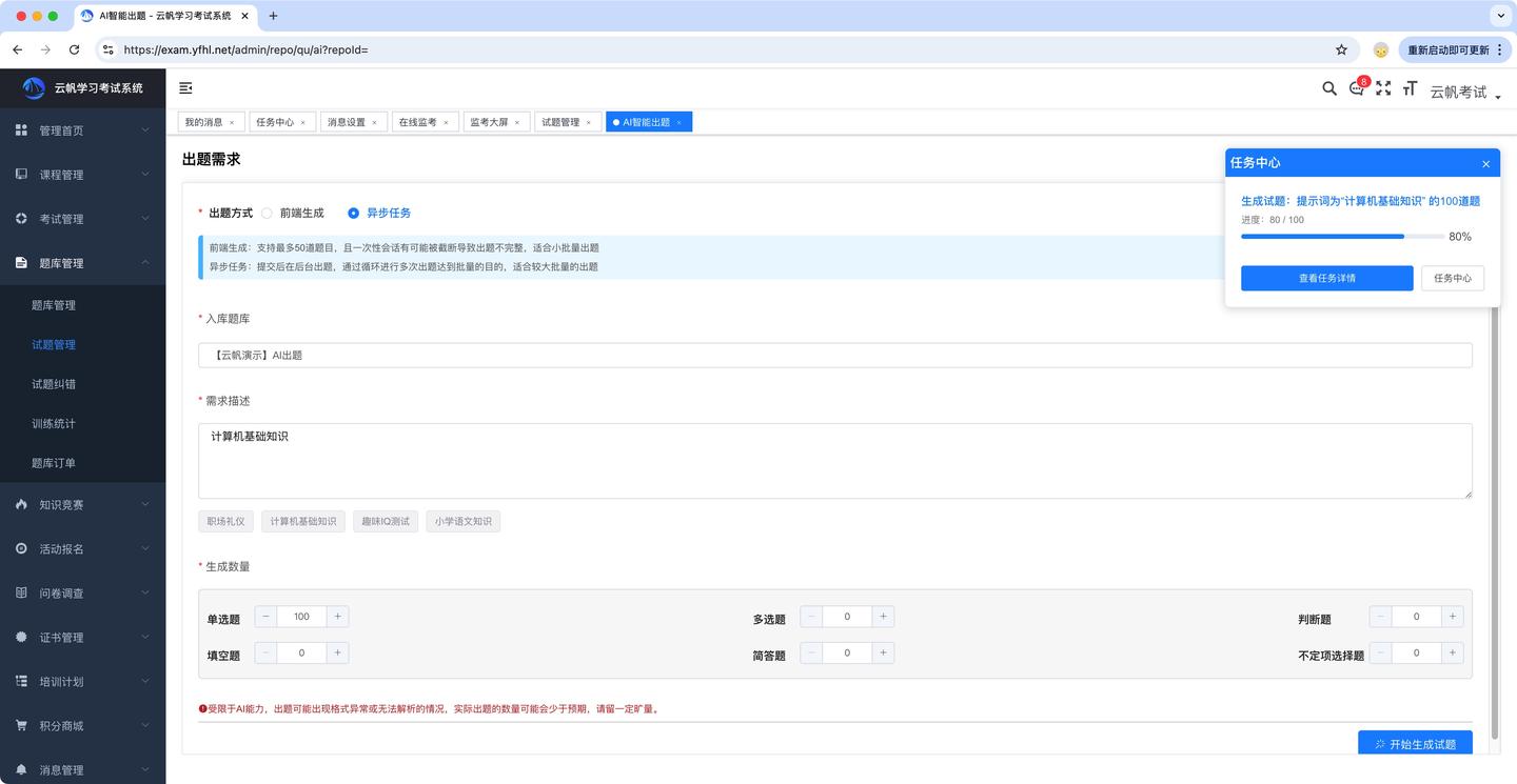 --大批量AI出题功能,增加异步任务实现大批量AI出题。