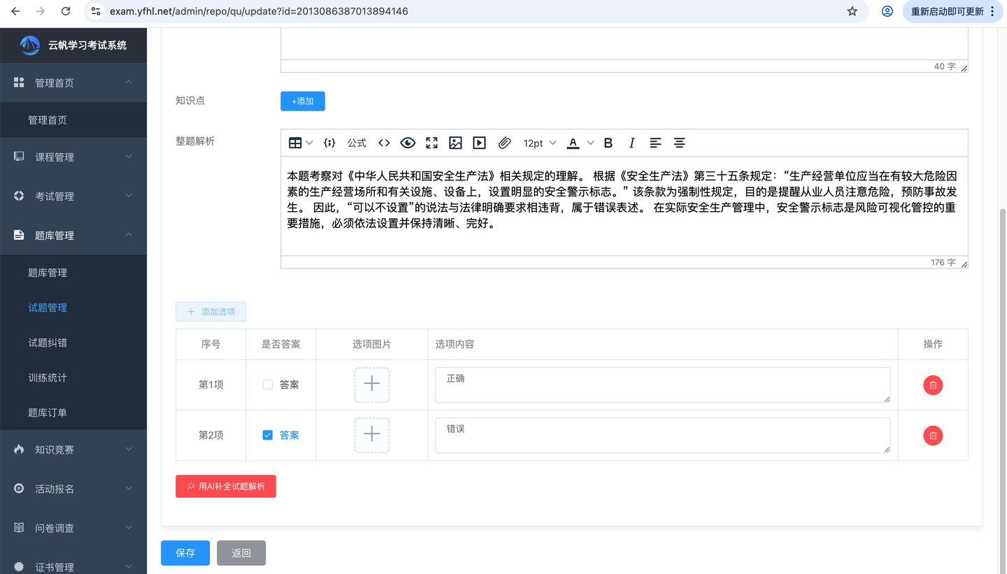 -- 新增AI自动填充解析功能,根据题干内容和参考答案,自动生成详细解析,便于学员查看