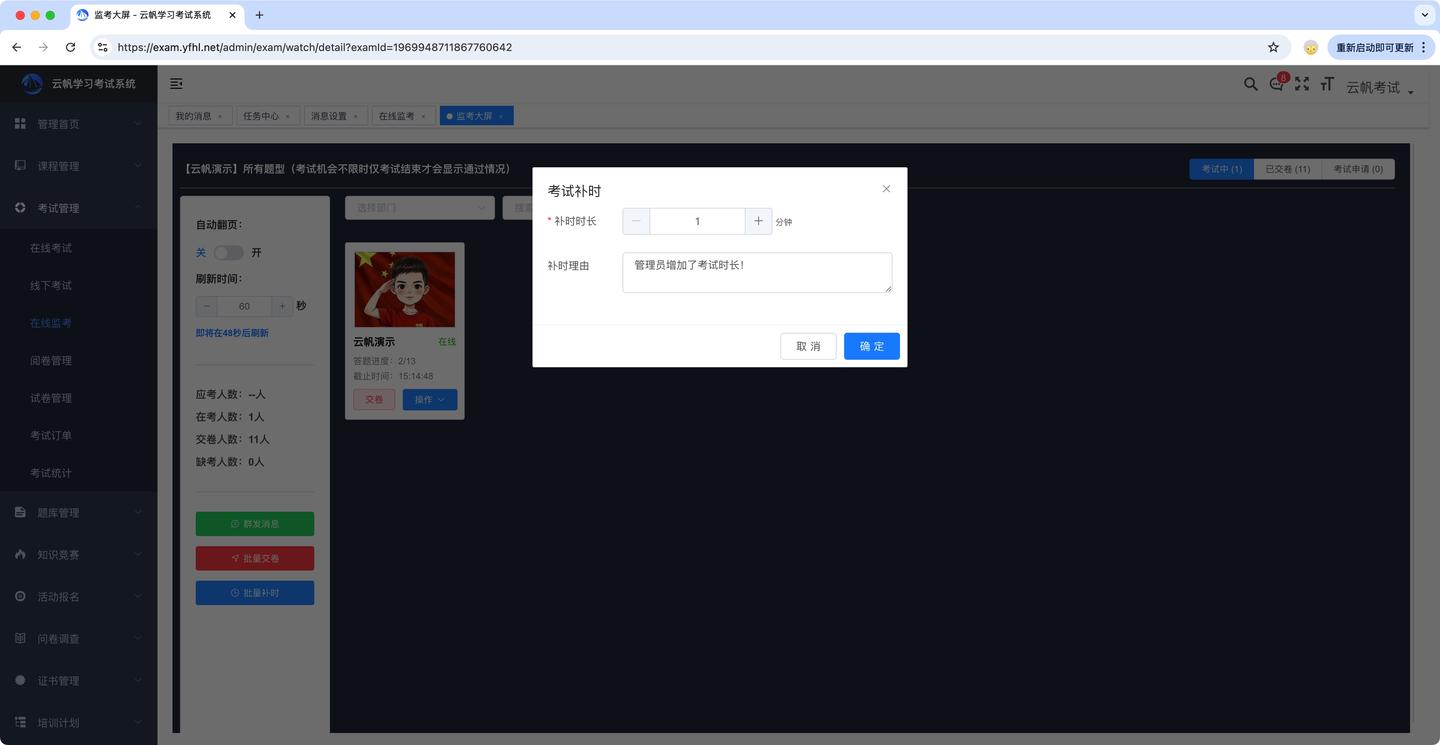 1、增加考试补时功能