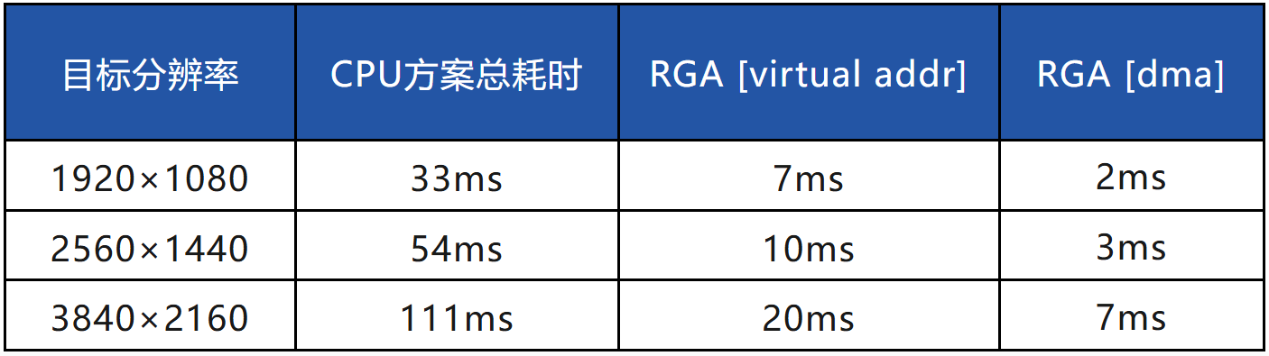 RGA的引入带来了数量级的性能提升,尤其是DMA模式,大幅降低了处理延迟。