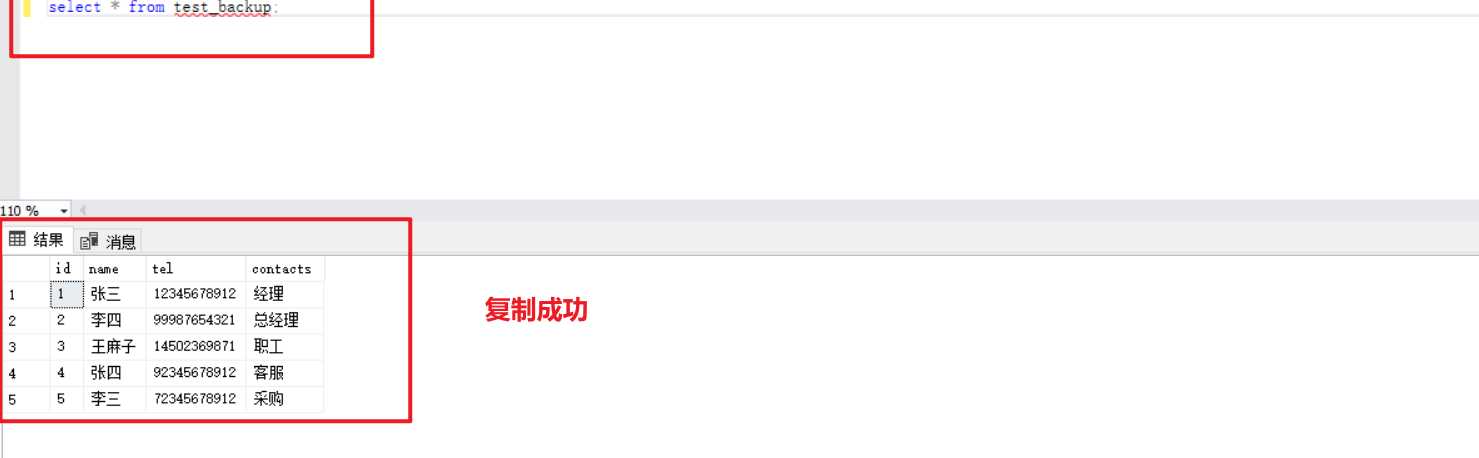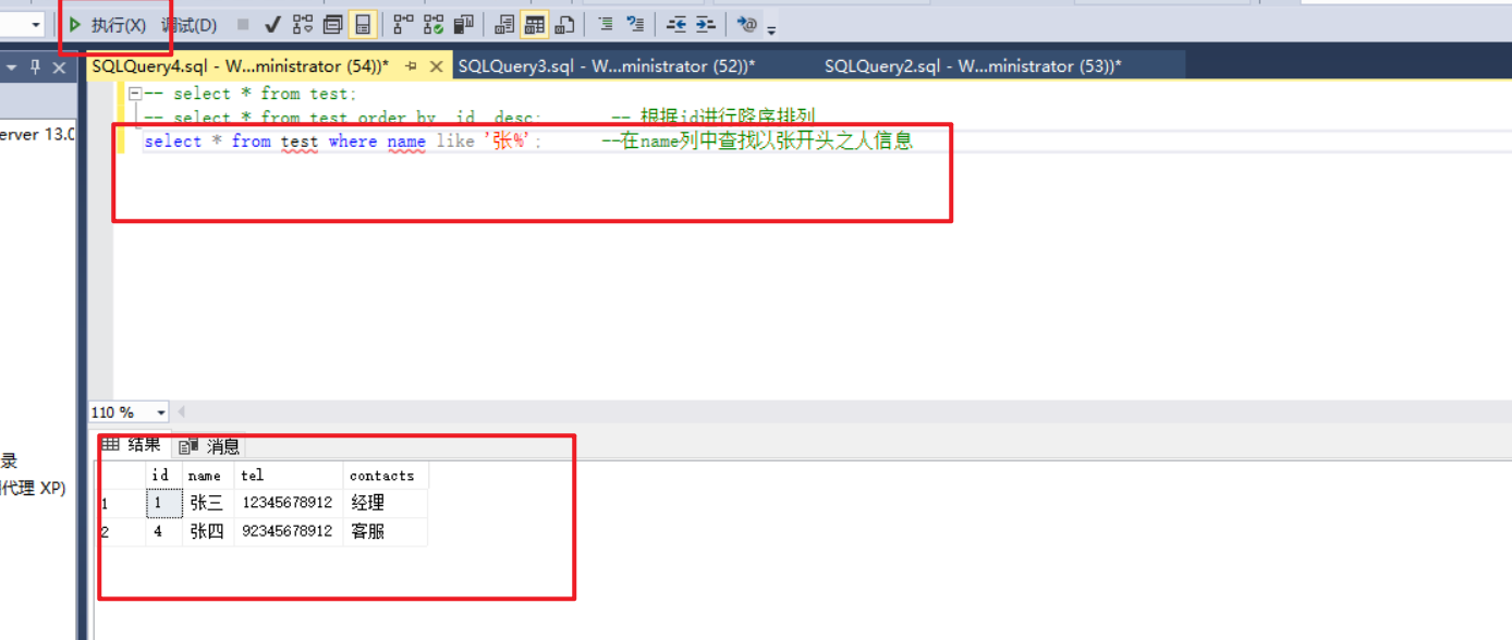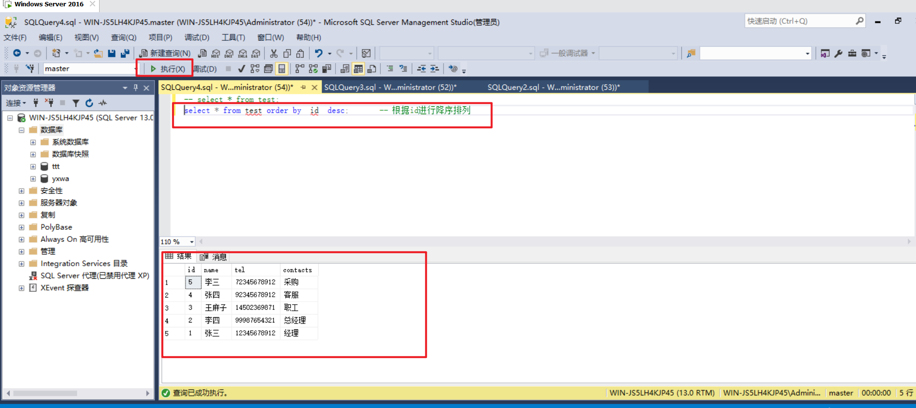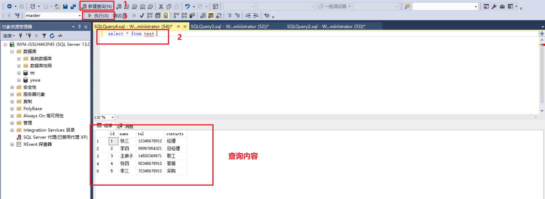 练习二:创建一个表,里面包含id,name,tel,contacts等信息,并用各种方式查询