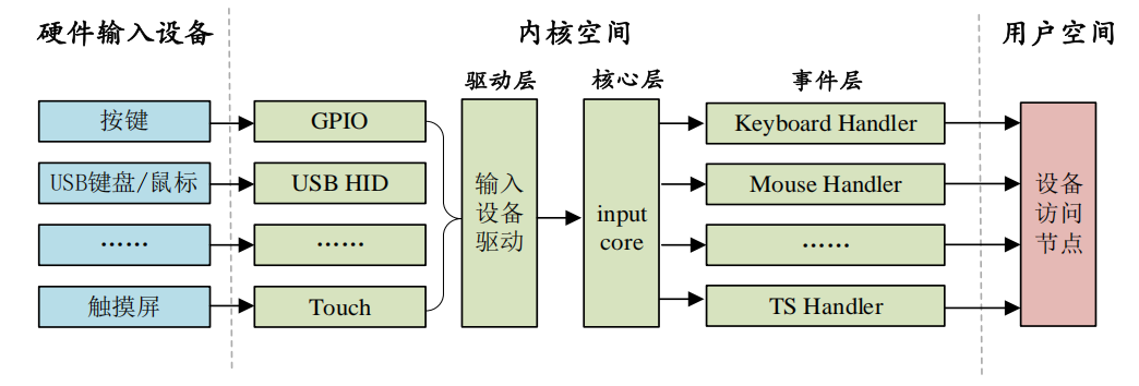 - 核心层 (Input Core):它负责管理设备注册,并匹配驱动和处理程序。