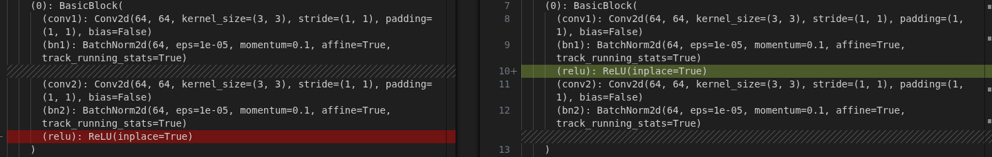 但这个模型和mmcv的配置不太一样,主要是两点,一是BasicBlock中ReLU模块的不同,二是输出特征维度不同。