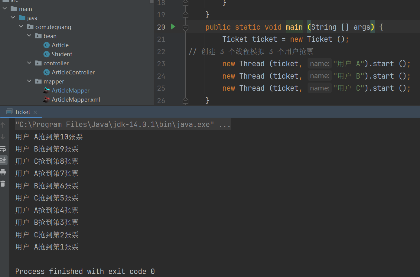 System.out.println (Thread.currentThread ().getName () + "抢到第" + ticket.totalTickets + "张票");