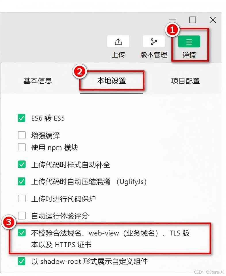 此时为了不耽误开发的进度,我们可以在微信开发者工具中,临时开启「开发环境不校验合法域名、web-view(业务域名) 、 TLS 版本及 HTTPS 证书 」选项,跳过 request 合法域名的校验。