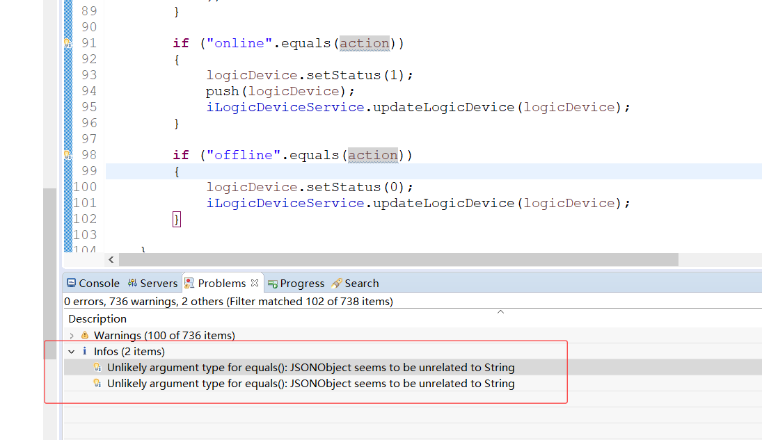 Unlikely argument type for equals(): JSONObject seems to be unrelated to String