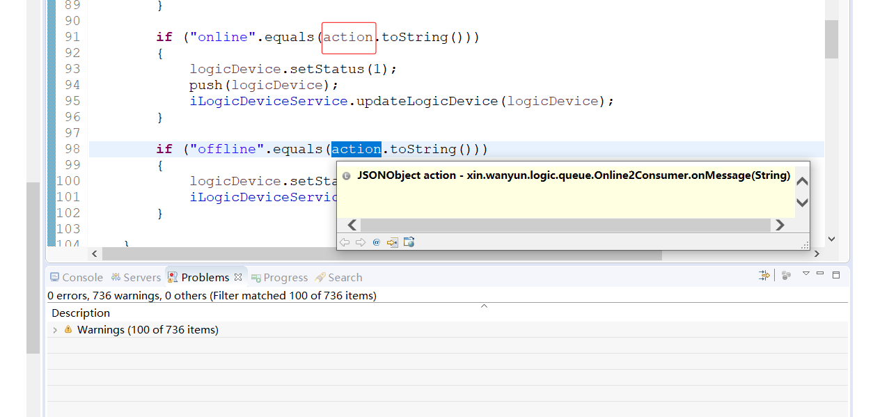 你试图用 JSONObject 类型的对象直接调用 equals() 方法和 String 类型的值做比较,而这两种类型在逻辑上是不相关的