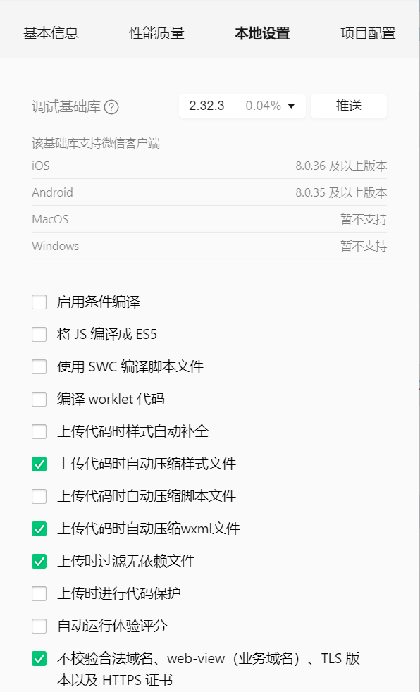 ③在"本地设置"中勾选"不校验合法域名、web-view(业务域名)、TLS 版本以及 HTTPS 证书"