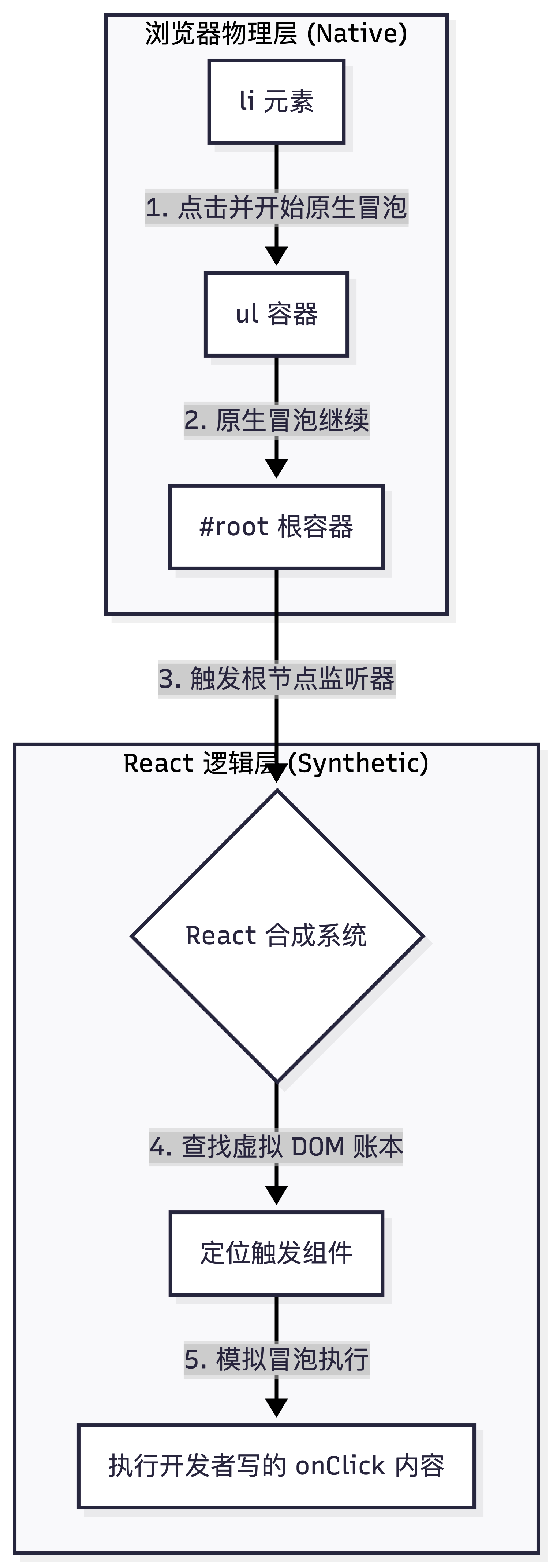 SyntheticEvent对象(抹平不同浏览器的 API 差异)。 - 模拟执行 :React 根据 Fiber 树结构,逆向找到从触发点到根节点的路径,依次执行路径上所有的
