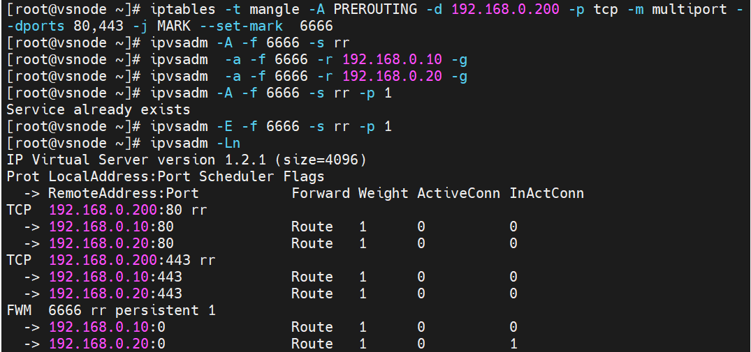 思路:在 PREROUTING 阶段把访问 VIP(192.168.0.200) 的 80/443 TCP 包打上同一 mark(例如 6666),然后在 ipvs 中基于该 fwmark 创建一个 service,把后端都加入该表。