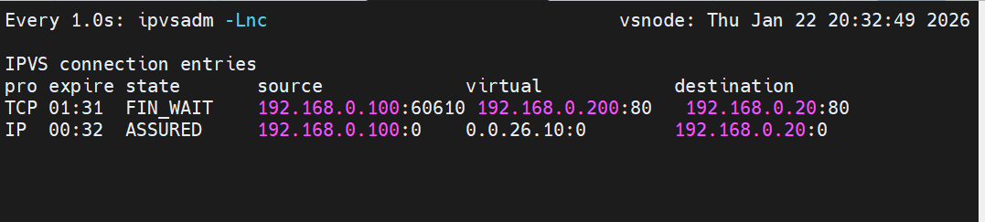 - 查看 ipvs 连接条目(含 conntrack 状态): ipvsadm -Lnc