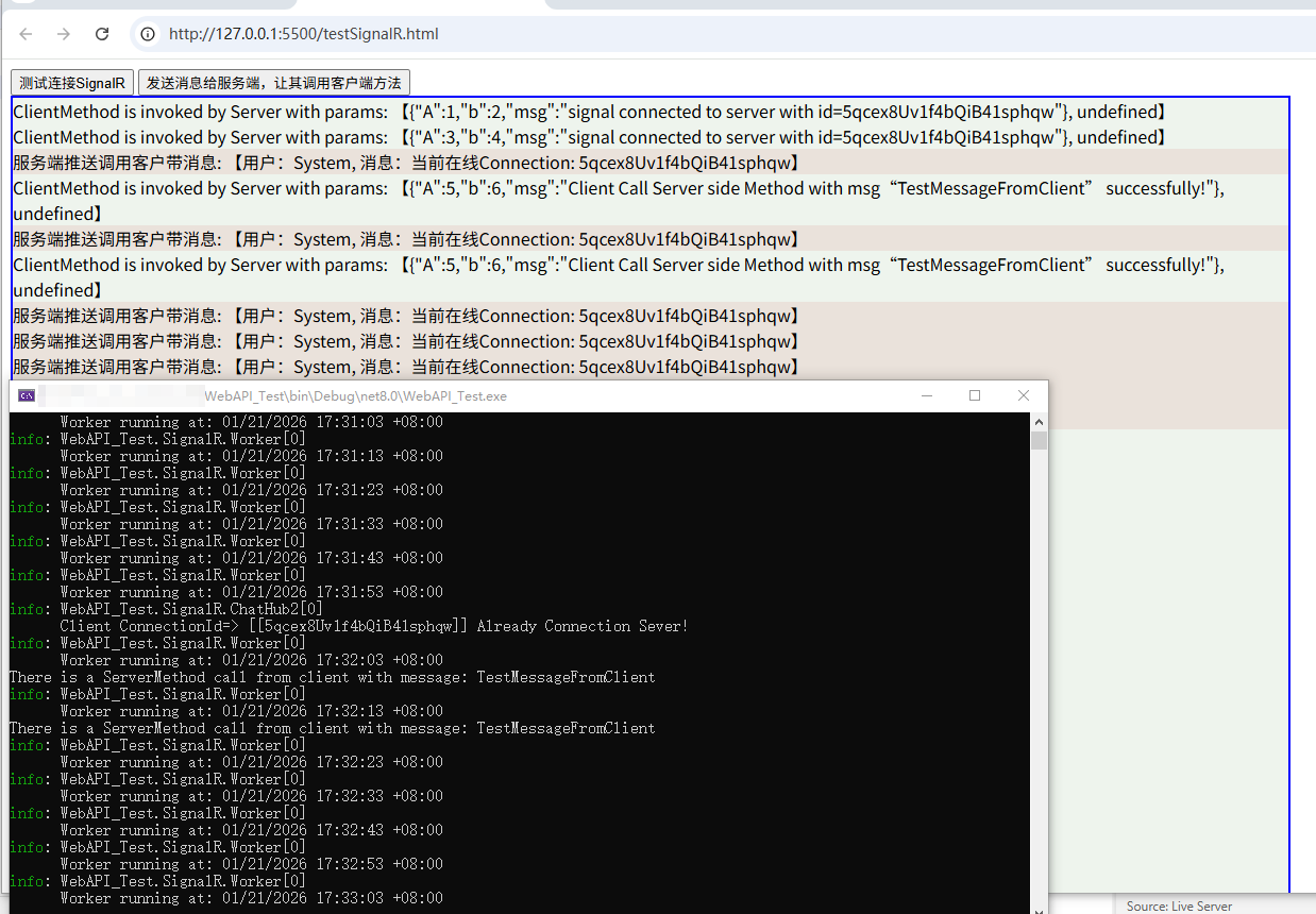 在VS Code中通过LiveServer 打开客户端,启动服务端进行测试,测试过程如下图所示