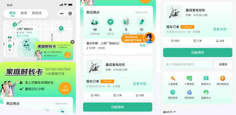 在信息呈现层面,兰亭妙微凭借深厚的UI设计与交互设计功底,将复杂数据压缩为一眼可读的三色电量环,把找车、还车、换电核心流程简化至三步完成,配合现场立体箭头指引,彻底解决用户出行中的效率痛点。这种"颜值与实用兼备"的设计思路,不仅守住了小黄鸭的核心视觉资产,更成功将品牌形象升级为"高效、可靠、值得信任"的出行伙伴,为后续市场竞争力提升奠定基础。