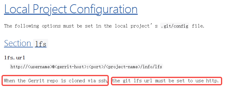 很多教程是配置到All-Project仓库的refs/meta/config,如果是另外搭建的lfs server服务,就不用,只在需要lfs管理的仓库里面,.git的同级目录添加一个**.lfsconfig**文件即可,官方及很多教程给的是.git/config上面添加lfs.url=,也不需要这样,这样操作每次clone完仓库需要手动改一下.git/config文件,会很麻烦,否则push的目标地址还是Gerrit lfs本身的服务,然后让输入https的账号密码。