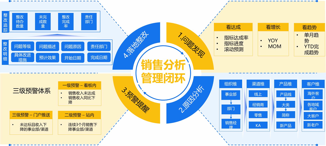 这套闭环体系销售分析的核心,就是让"数据"和"业务"绑定:从发现问题的"信号",到定位原因的"拆解",再到预警的"提醒"、整改的"落地",每一步都对应具体的业务动作。