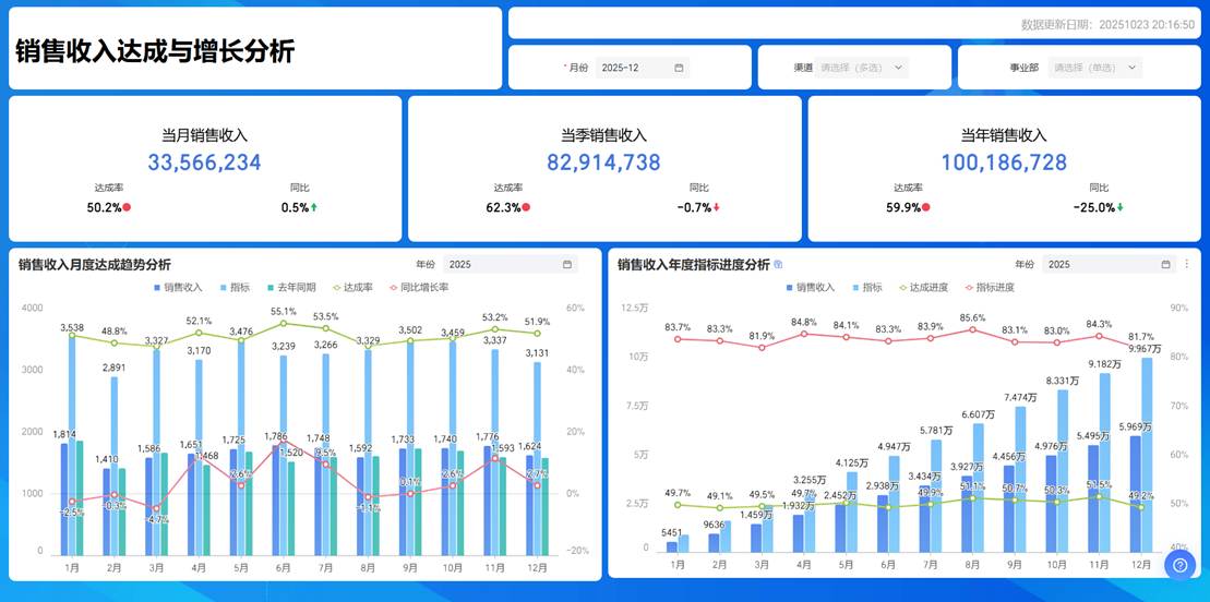 通过"看达成、看增长、看趋势"3类数据指标(比如指标达成率、YOY/MOM增长、YTD完成趋势),识别销售中的异常问题。