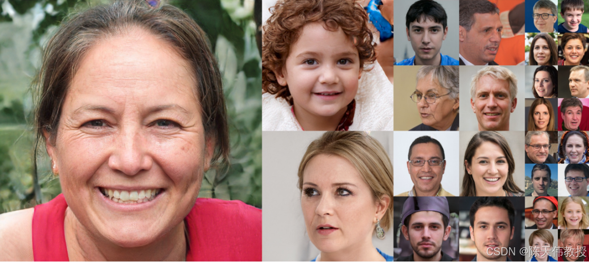 当我们用GAN 生成人脸时,一张随机噪声图片可以被看作是一组生成因子的组合,生成器将这些因子"转化"成一张人脸。当训练数据足够丰富时,生成器可以产生几乎无法与真实照片区分的合成人脸。图 27.3展示了通过 GAN 生成的虚假人脸------它们看起来和真实人脸几乎没有区别。