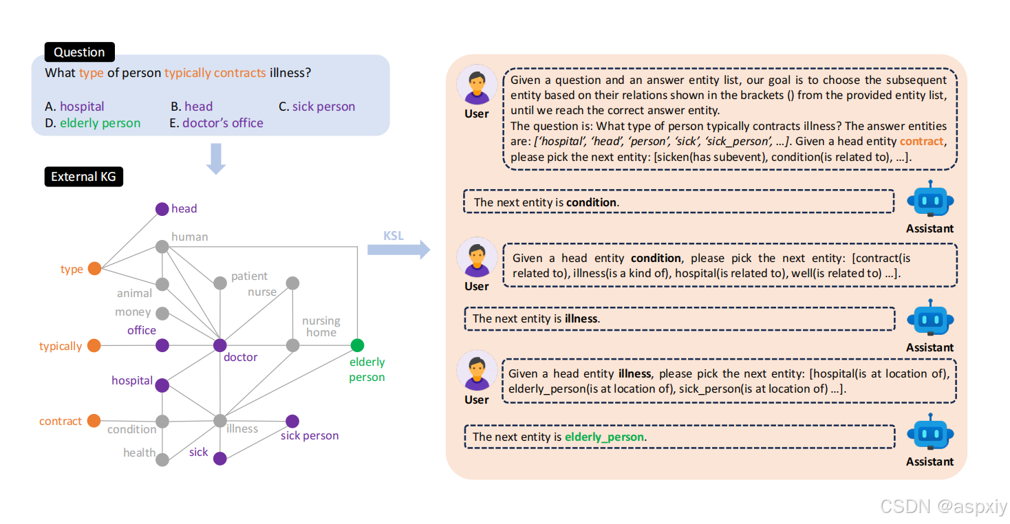 如图2所示,我们的方法KSL首先从知识图谱中检索与给定问题选项对[q, A]相关的子图Gsub。然后,我们将Gsub编码为文本提示TK,注入到LLMs中,这将初始化类似对话的推理过程,鼓励LLMs利用自身能力搜索必要的知识,并引导自己实现最终目标。
