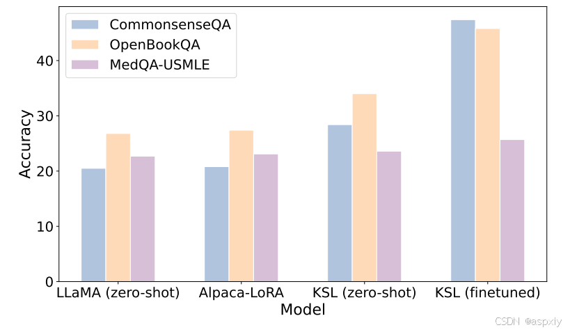 我们在三个数据集上评估了我们的方法:CommonsenseQA、OpenbookQA和MedQA-USMLE,这些数据集都需要知识推理。KSL在零样本和微调设置中都显著提高了LLMs基线的性能。