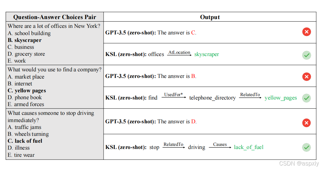 图4:KSL(GPT-3.5)的定性结果。展示了GPT-3.5和零样本KSL(GPT-3.5)在一些示例上的生成回答。加粗的选择表示正确答案。星号()表示关系被反转。*
