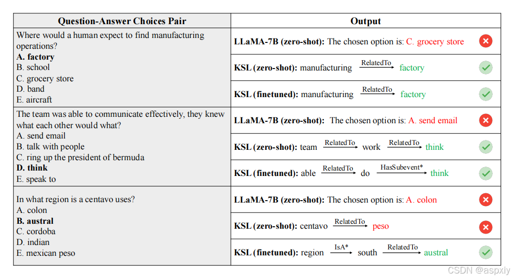 图5:KSL(LLaMA-7B)的定性结果。展示了LLaMA-7B以及零样本/微调后的KSL(LLaMA-7B)在一些示例上的生成回答。加粗的选择表示正确答案。星号()表示关系被反转。*