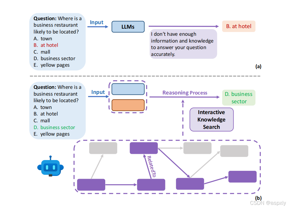 图1:知识求解器。图中展示了在问答任务中,普通语言模型(a)和零样本知识求解器(b)的对比示例。我们的方法通过利用语言模型自身的泛化能力,帮助其搜索执行任务所需的必要知识。图中紫色部分表示语言模型选择的正确路径中的节点和关系。