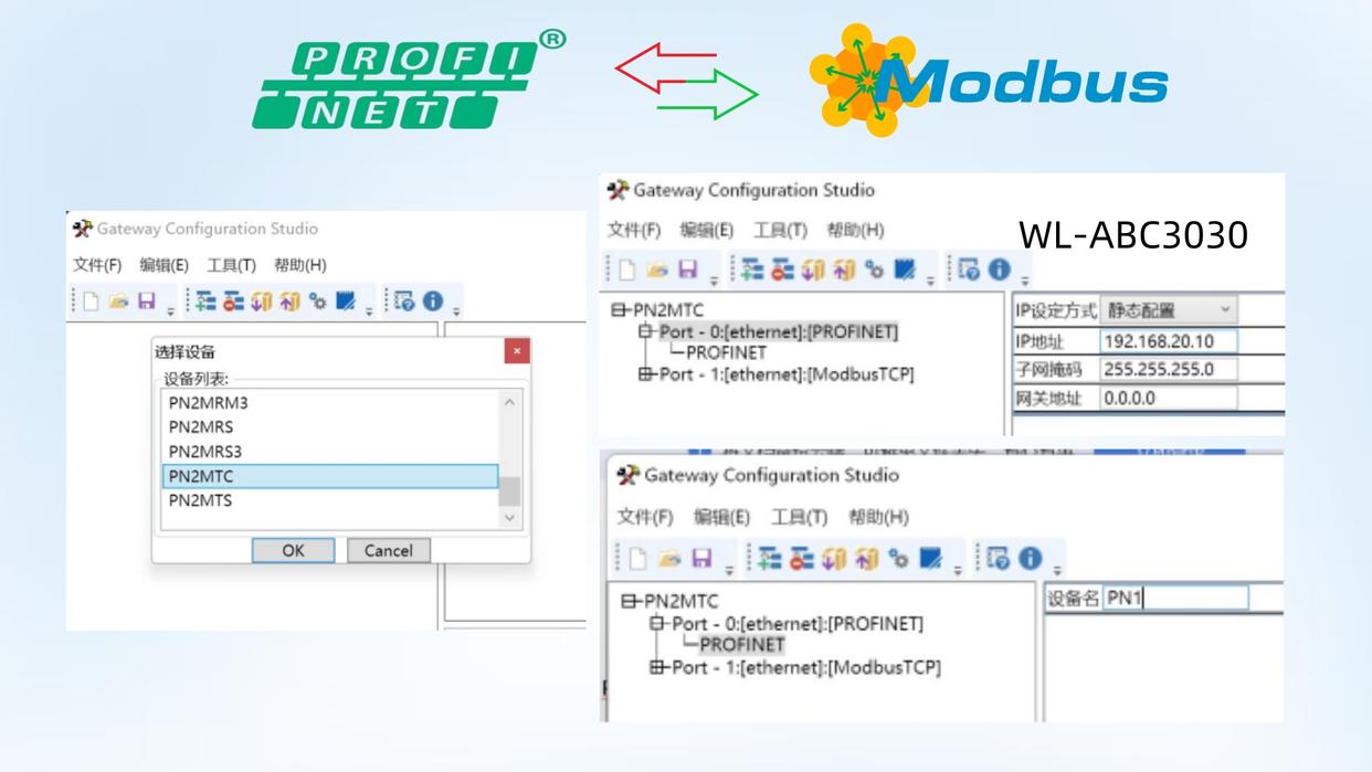 将组态下载至可编程逻辑控制器(PLC),设定好机器人的互联网协议(IP)地址,开启网关配置软件。鉴于Profinet转ModbusTCP网关充当ModbusTCP客户端,故选择PN2MTC。设置Profinet转ModbusTCP网关Profinet端的互联网协议(IP)地址以及设备名称(需与博图组态保持一致)。