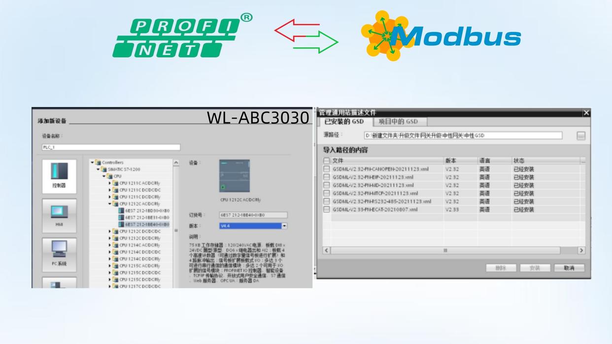 配置流程:首先开启西门子博图配置软件,添加可编程逻辑控制器(PLC)的具体型号,导入Profinet转ModbusTCP网关的通用站描述(GSD)文件。