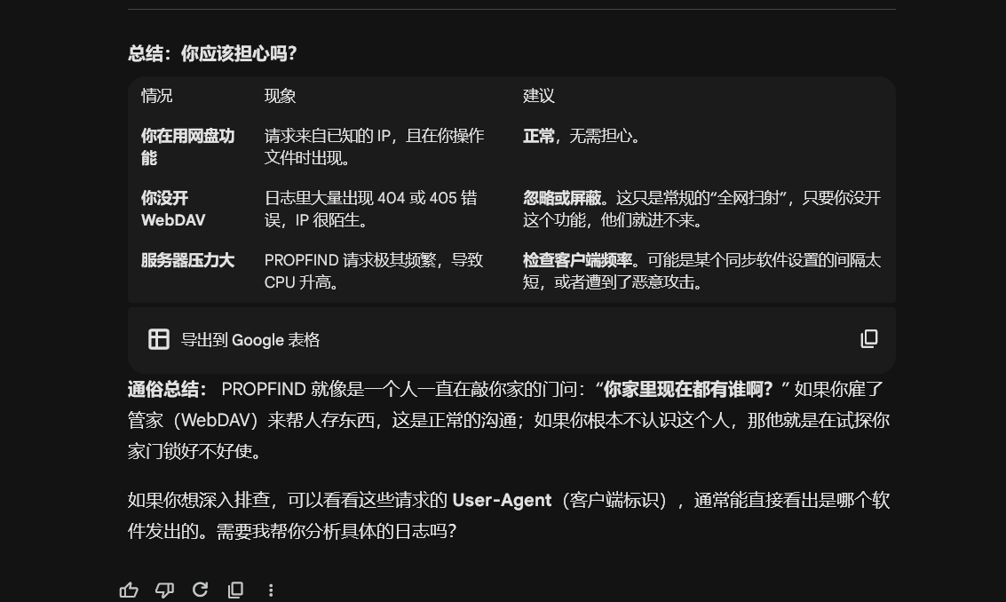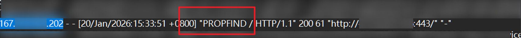 仔细看了一下他的请求方式: PROPFIND,这种通常是自动扫描器在探测 WebDAV 漏洞或共享目录