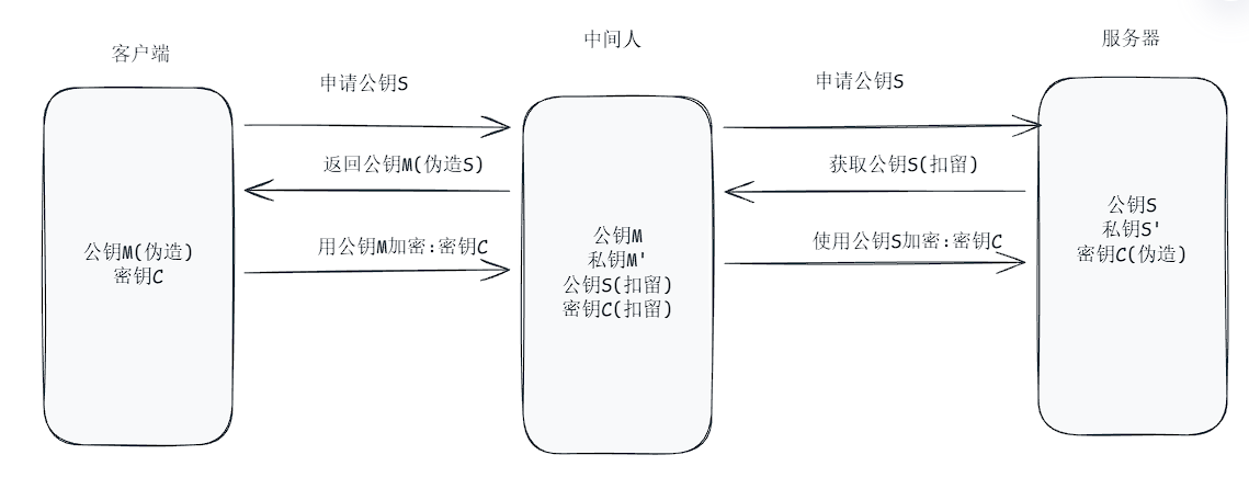 双方开始使用 C 进行对称加密通信,但整个通信已被中间人完全掌控 :可窃听、可篡改。(因为双发发的是以M加密的MC和以S'加密的S'C,这两个中间人有对于的私钥M'和公钥S)
