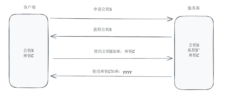 一开始服务器有公钥 S 和私钥 S' , 在客户端发起请求时,服务器发送证书 (该证书携带了公钥 S),客户端内置了 CA 公钥 (以受信任根证书形式存在),通过 CA 验证服务器证书 ,从而安全获取公钥 S ,客户端生成对称密钥 C ,并用公钥 S 加密 C 后发送给服务器 ,服务器用私钥 S' 解密 得到密钥 C,此后,双方使用密钥 C 进行对称加密通信。