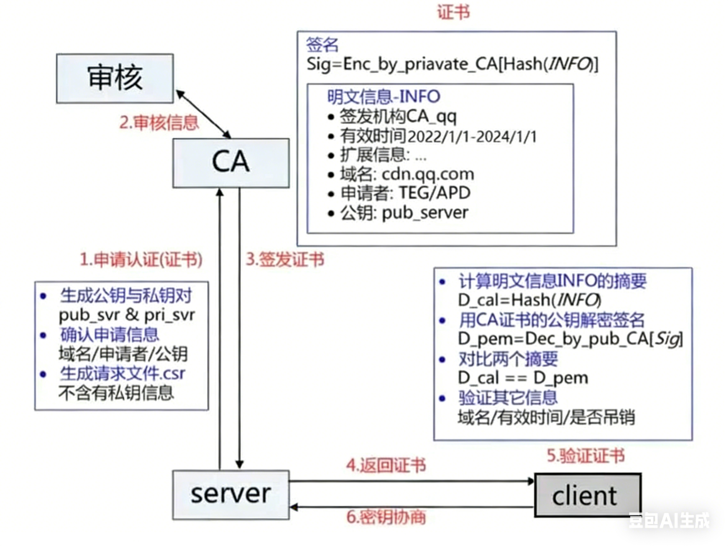 客户端持有:CA 公钥(用于验证,内置的)、公钥 S(从证书中提取)、密钥 C