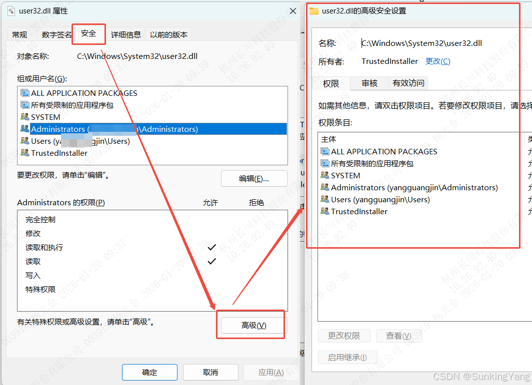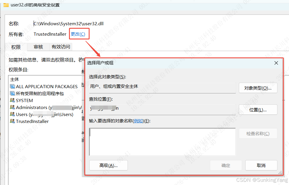 user32.dll默认所有者是TrustedInstaller(系统虚拟账户),需先将所有权转移至当前管理员账户: