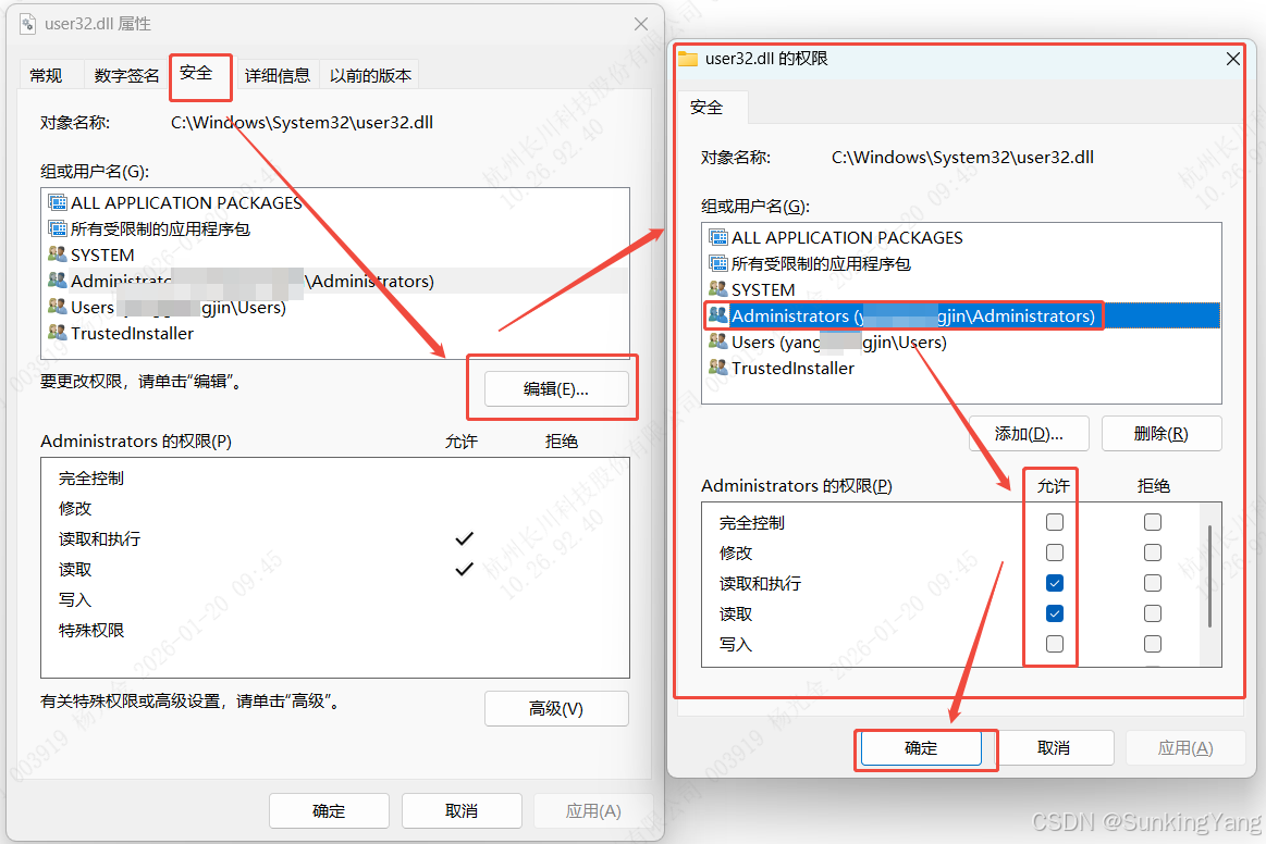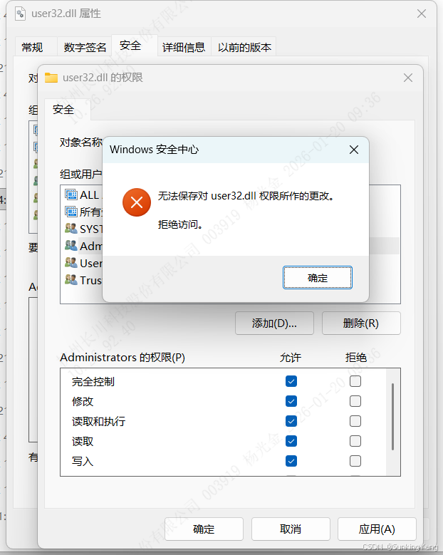 user32.dll的"属性"→安全 →编辑。 - 在"组或用户名"中,选中当前管理员账户(如
