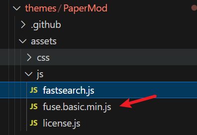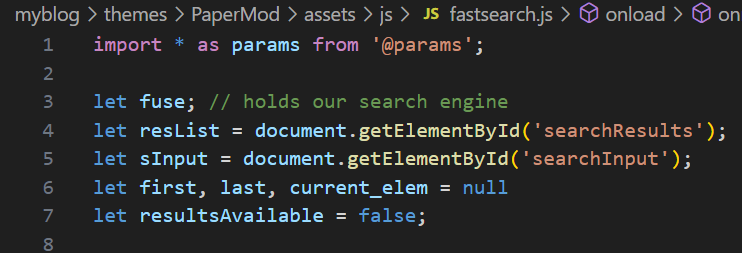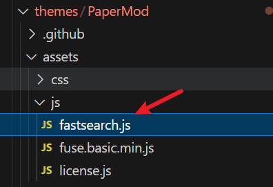 OK,介绍完搜索页面的布局,下面来看搜索功能的实现,Hugo PaperMod 的搜索实现在 assets/js/fastsearch.js