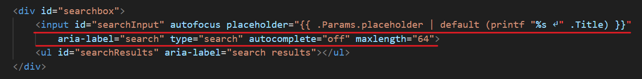 aria-label="search":无障碍访问,告诉屏幕阅读器这是搜索框 ,屏幕阅读器是视障人士(比如盲人)用的软件,它会把网页内容用语音方式读出来给他们听,而aria-label就是直接给元素起个语音名字,让盲人或视障用户通过读屏软件知道这里是个搜索框,可以提升网站的无障碍访问能力,这里 ARIA 全称 Accessible Rich Internet Applications,这个 HTML 属性专门用来增强网页对辅助技术的友好度type="search":告诉浏览器,这是个搜索框类型,这样浏览器可以提供更好的移动端支持,并且语义更清晰, 对人,对机器都友好,可以让站点更专业,更好用autocomplete="off":禁用浏览器自动填充历史,避免干扰搜索建议maxlength="64":限制最多输入 64 个字符