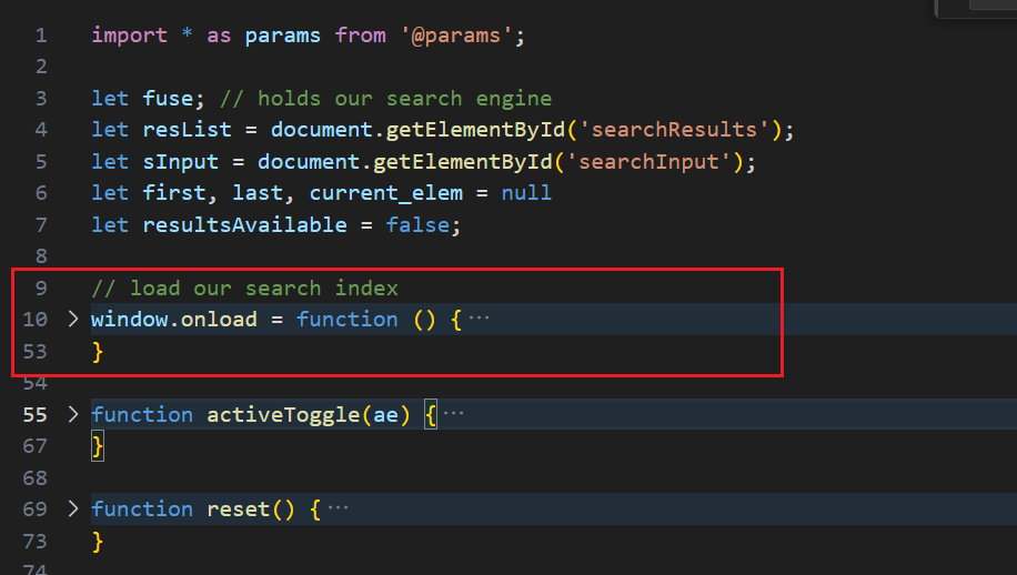 import * as params...:从 Hugo 构建系统导入配置参数fuse:使用的模糊搜索方法,这个变量用来存搜索引擎,fuse 实例,引擎实现就是下面的fuse.basic.min.js