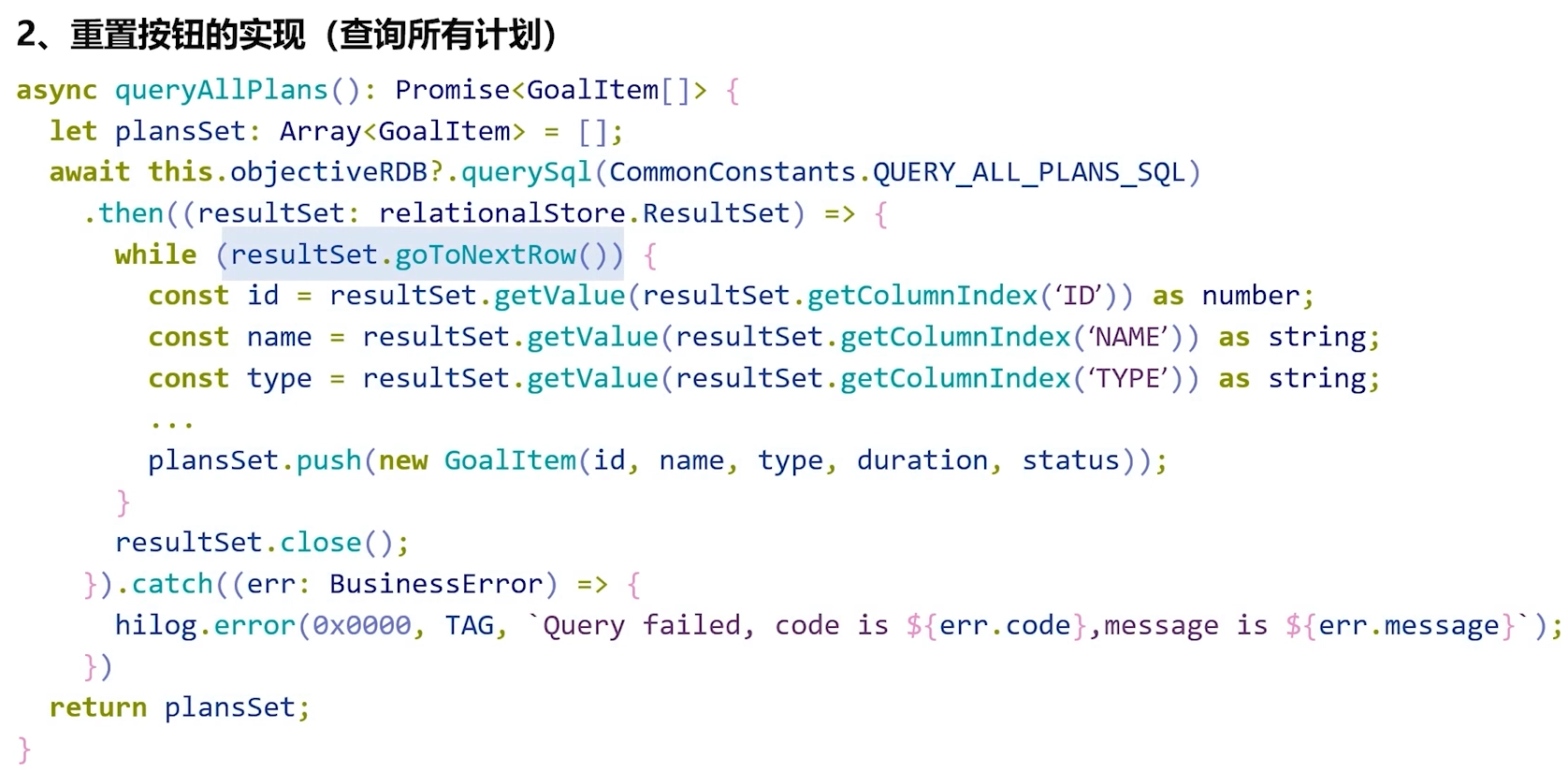 - 要实现重置按钮的功能,我们需要查询所有的计划记录,这可以通过调用querySql方法,并传递一个查询所有计划的SQL语句作为参数来完成,由于ResultSet可能包含多行数据,因此我们可以利用goToNextRow方法进行循环遍历,以逐行获取所有数据,在遍历每一行数据时,我们可以使用getValue方法来获取某个字段的具体值,此时需要将传递的参数设置为字段名,并且需要将获取到的值,强制转换为相应的数据类型。