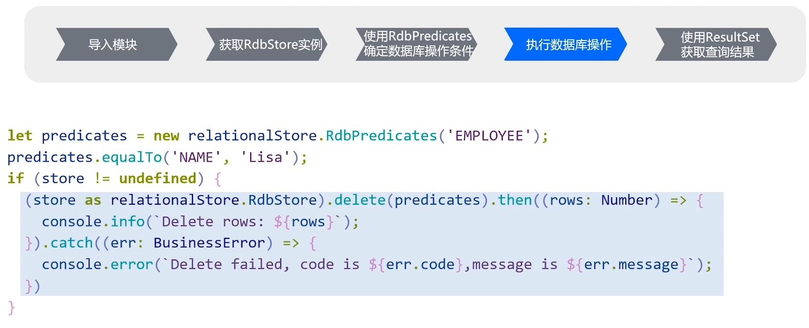 执行数据库操作时,我们主要依赖于RdbStore提供的数据库操作接口,以下面的代码为例,它执行了一个删除操作,结合RdbPredicates设置的筛选条件,成功筛选了EMPLOYEE表中NAME字段值为Lisa的记录,并返回了受影响的行数,随后打印出来,这样我们完成了一个基于筛选条件的删除数据库操作。