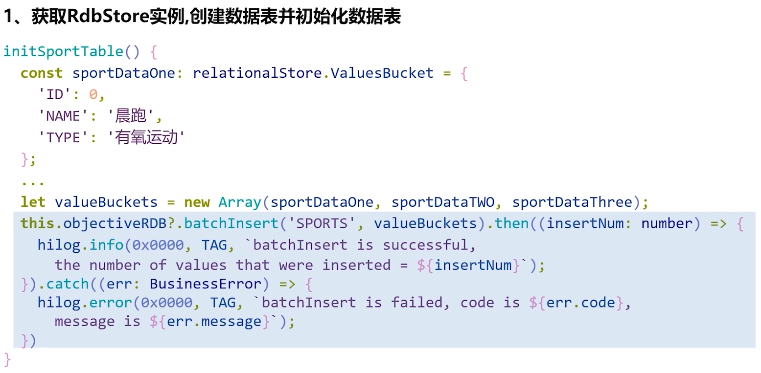 - 接下来我们使用batchInsert方法,向运动表中批量添加一些数据,这里我们省略了一些数据,该方法的参数包括表名以及需要插入的数据,其中数据需要封装成ValuesBucket类型