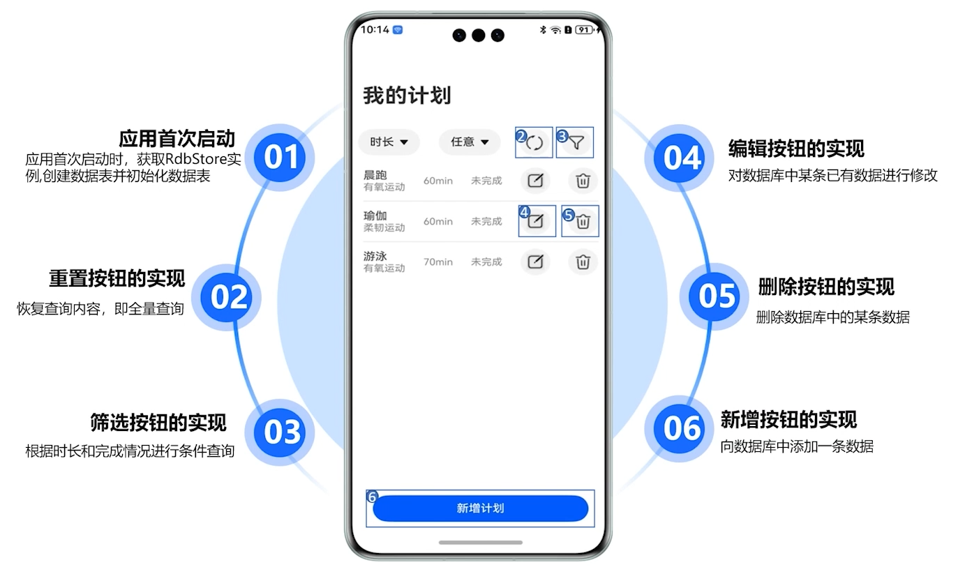 - 获取RdbStore实例后,接下来的步骤是创建并初始化数据表,本次操作设计两张表,运动表和计划表,运动表的设计包含三个字段,ID作为主键,运动名以及运动类型。为了创建这些表,我们将使用execute方法执行SQL语句,该方法支持执行增删改操作,也支持PRAGMA语法的SQL,以及对表的各种操作,如建表、删表、修改表。需要注意的是,execute方法不支持执行查询操作,附加数据表和事务操作,如果需要这些功能,可以使用querySql、query、attach、beginTransaction和commit等接口。现在我们将使用execute方法,来编写和执行创建运动表和计划表的SQL语句,并完成必要的初始化工作。首先是运动表的创建,同样的我们也可以使用execute方法创建计划表,其字段有主键ID、指向运动表ID的外键sport_id,运动时长duration和完成状态status.