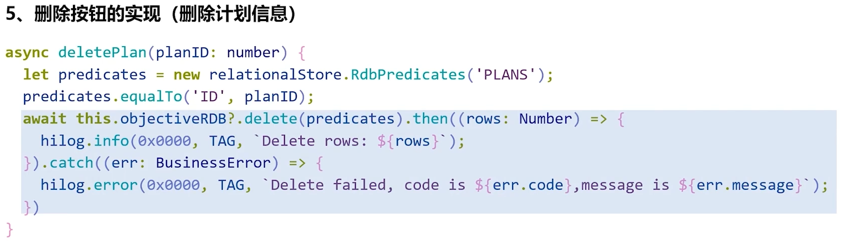 - 删除操作可以通过delete方法来实现,只需将筛选条件RdbPredicates传入该方法,即可完成对应记录的删除。