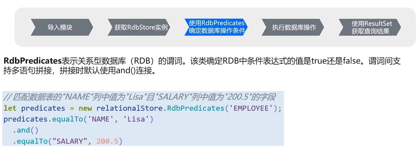 在成功获取RdbStore实例后,进行数据库操作之前,我们可以利用RdbPredicates来设定筛选条件,RdbPredicates表示关系型数据库的谓词。。该类确定RDB中条件表达式的值是true还是false。谓词间支持多语句拼接,拼接时默认使用and()连接。