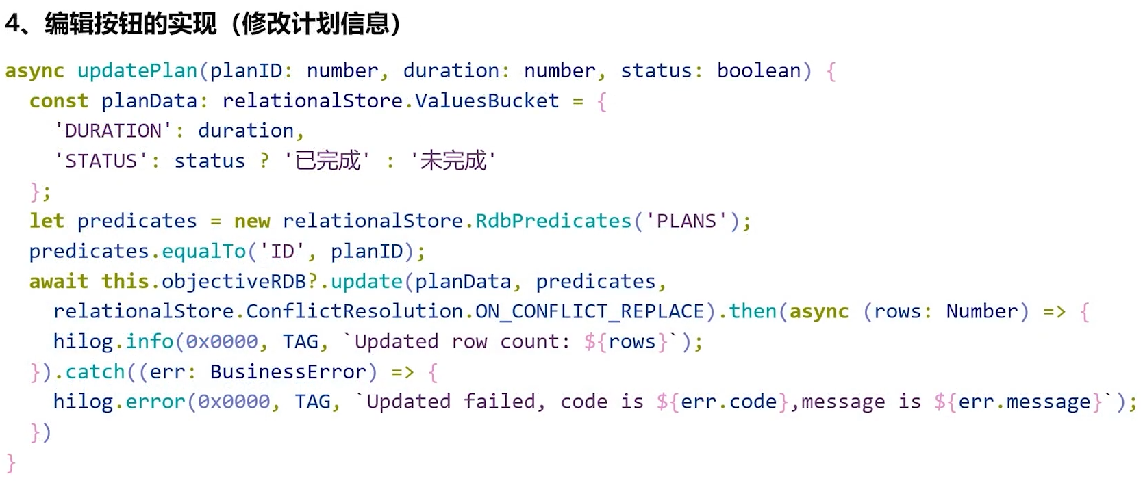 - 编辑按钮的功能是通过update方法来实现的,我们需要先使用RdbPredicates来筛选出具有特定ID的记录,然后将新的目标值以及这个筛选条件作为参数传递给update的方法,以便更新这些记录。