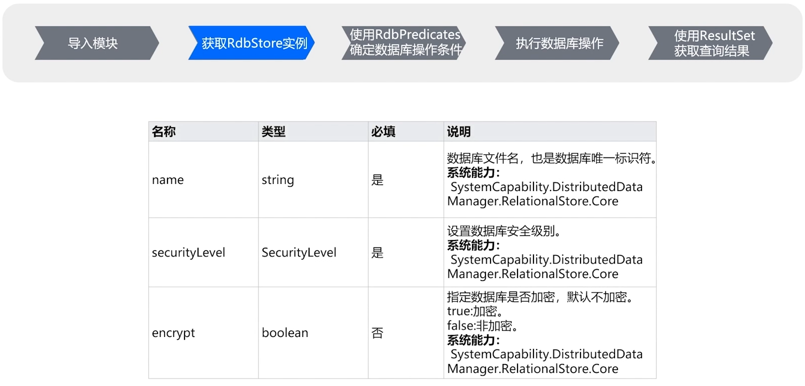 在成功导入模块后,下一步是提取RdbStore实例,RdbStore是一个提供管理关系型数据库方法接口的类。通过调用getRdbStore方法,我们可以获取到关系型数据库的实例。getRdbStore方法的第一个参数是应用上下文;第二个参数则是数据库的配置信息,数据库配置涵盖多种信息,例如数据库文件名、安全级别以及是否加密等,这些都是较为常用的配置,当然关系型数据库还支持其他多种配置参数,可以查阅关系型数据库的API参考文档,以获取更全面的信息。